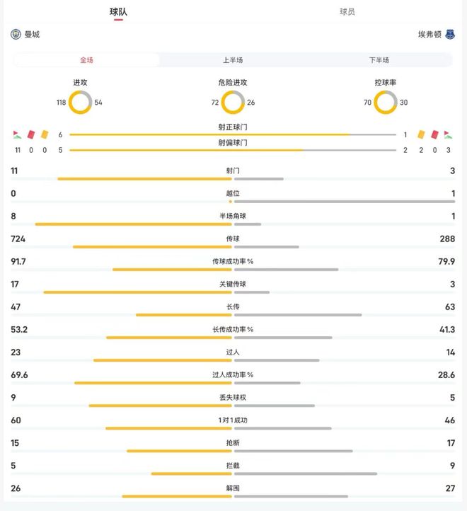 曼城vs埃弗顿全场数据:射门11-3,控球率70%-30%